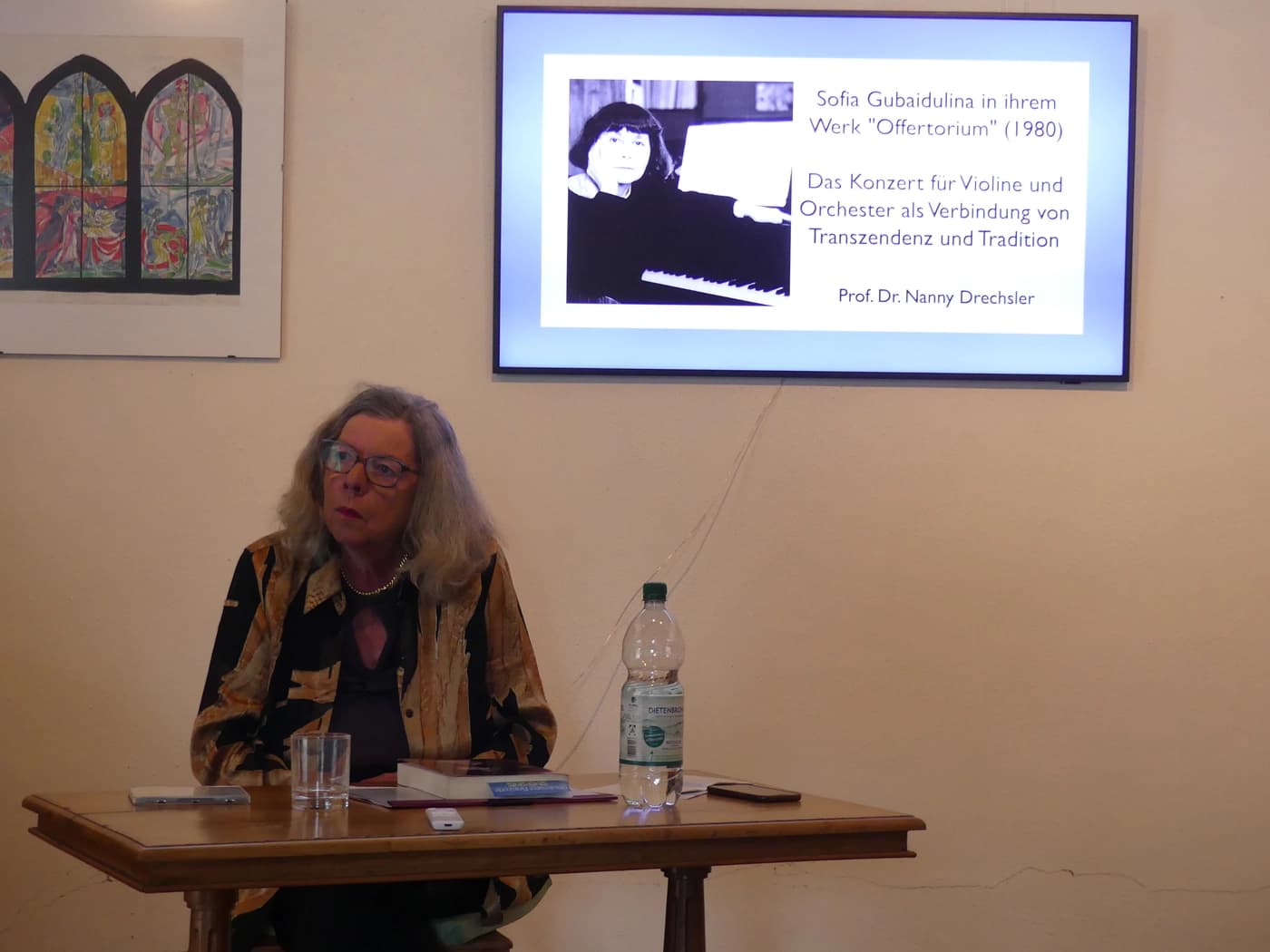 Hier stand der Vortrag von Prof. Nanny Drechsler über ein Werk Sophia Gubaidulina auf dem Programm. Gubaidulina komponierte das „Offertorium“ 1980 und führte uns Zuhörenden in die Zeit und Welt des totalitären Unsinns in der Sowjetunion, den sie erlebt, durchlebt und überlebt hat. Diese Musik spricht ohne Worte in einer Dimension, in der Chaos, Mystik, Gewalt, Schmerz, Protest und Hoffnung vereinigt sind. Es bedurfte viel Mutes und Kraft, sich diesem Klangwerk auszusetzen, es anzuhören, anzunehmen, im Wortlosen das Gesagte zu erkennen.